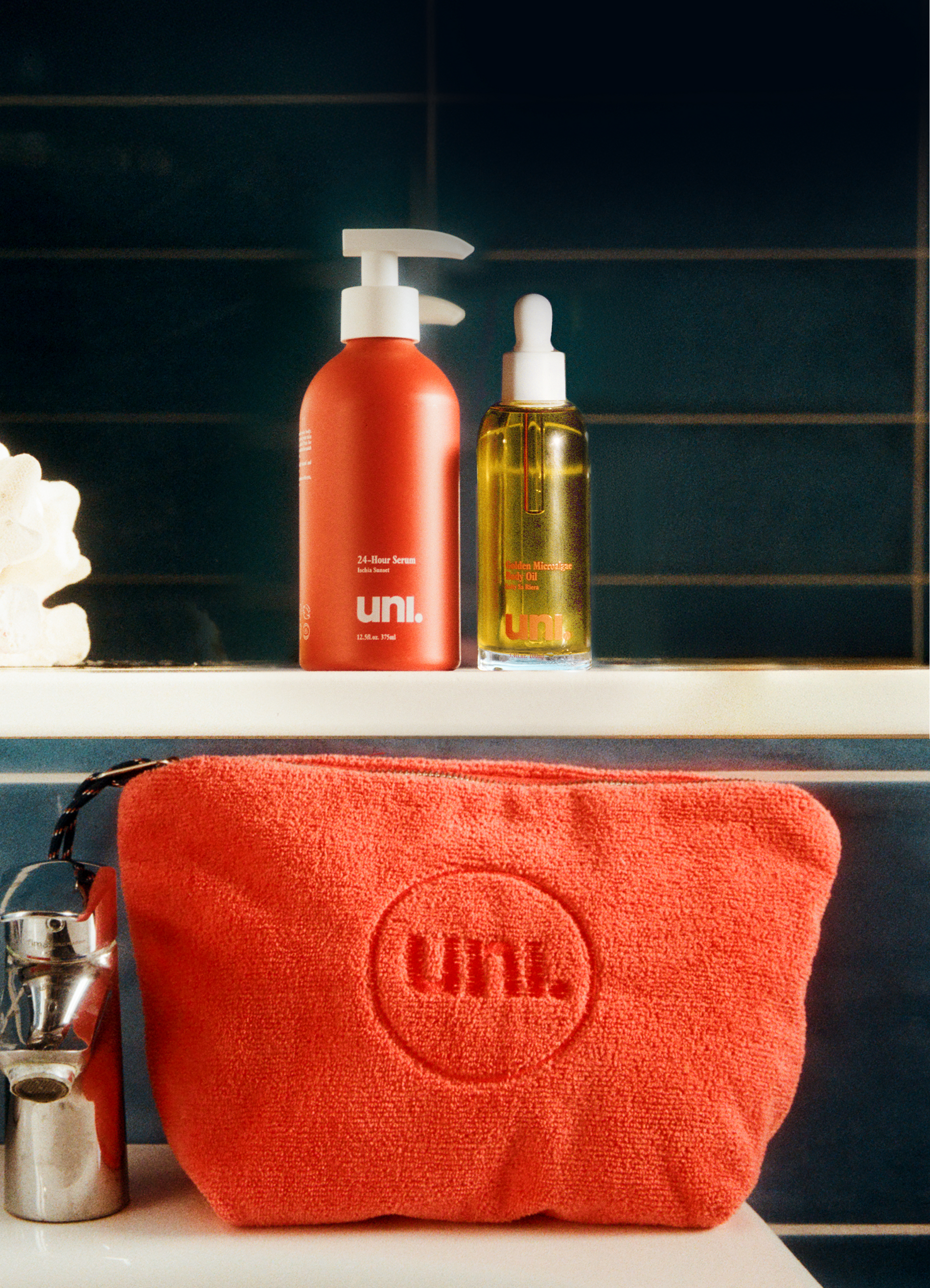 Hydration that glows. A two-step ritual built around Uni Marine Complex™ for lasting radiance. The 24-Hour Serum and Golden Microalgae Body Oil brighten, sculpt, and hydrate with a weightless, luxurious feel—delivering a smooth finish, enhanced contour, and a lasting glow, all in a travel-ready Terry Bag.